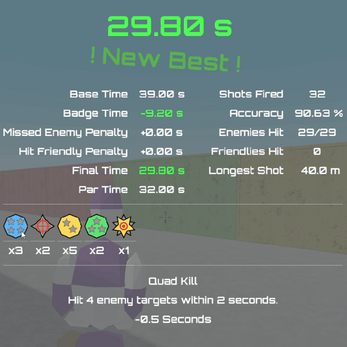 Time trial shooting across 5 levels from a third person perspective. See how much you can beat the par times. Reduce your time by earning badges and hitting all enemy targets while avoiding friendly targets.